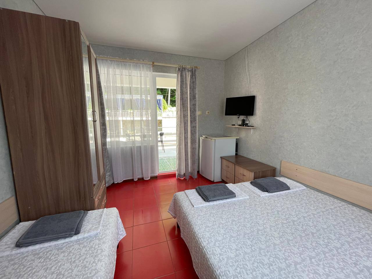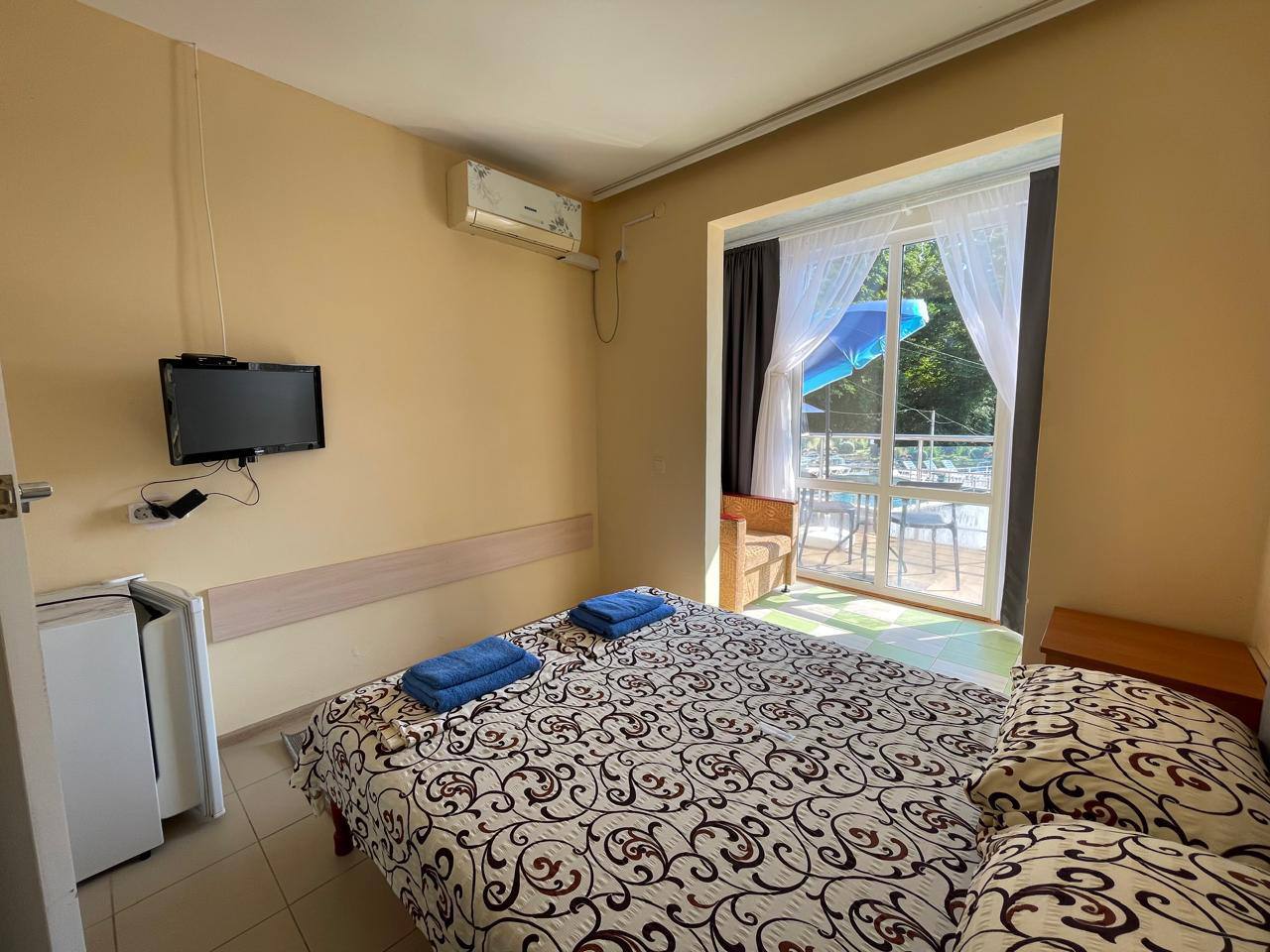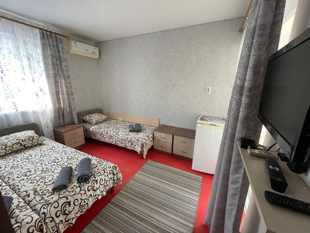 - Современные оборудованные номера: кондиционер, холодильник, телевизор, душ, c/у, банные полотенца;